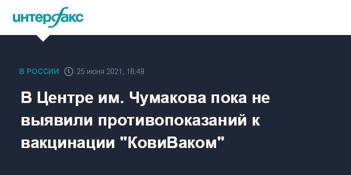 Москва. 25 июня. INTERFAX.RU - Центр имени Чумакова РАН пока не зафиксировал противопоказаний применения вакцины от коронавируса "КовиВак" для людей с сопутствующими заболеваниями, заявил директор центра Айдар Ишмухаметов.