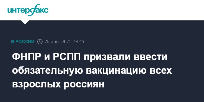 Москва. 25 июня. INTERFAX.RU - Федерация независимых профсоюзов России (ФНПР) и Российский союз промышленников и предпринимателей (РСПП) обратились к правительству РФ с призывом принять решение об обязательной вакцинации взрослого населения страны от коронавируса.