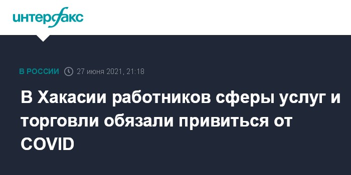 Москва. 27 июня. INTERFAX.RU - Главный государственный санитарный врач Хакасии Татьяна Романова подписала постановление об обязательной вакцинации от COVID-19 отдельных групп жителей республики, сообщает региональный Роспотребнадзор в воскресенье.