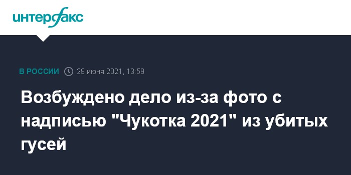 Москва. 29 июня. INTERFAX.RU - Следователи на Чукотке возбудили уголовное дело о незаконной охоте после публикации в соцсети фотографии, на которой охотник выложил из десятков убитых им на охоте гусей надпись "Чукотка 2021", сообщило во вторник управление СКР по региону.