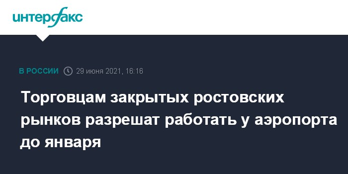 Москва. 29 июня. INTERFAX.RU - Администрация Ростова-на-Дону разрешила торговцам с недавно закрытых рынков Аксайского района работать на временной ярмарке на территории старого аэропорта до 31 декабря 2021 года, сообщила директор департамента потребительского рынка региона Ирина Теларова.