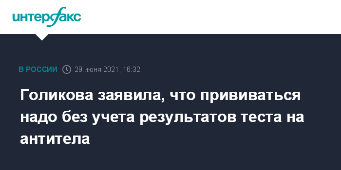 Москва. 29 июня. INTERFAX.RU - Прививаться от коронавируса нужно без учета показателей анализа на антитела, заявила вице-премьер РФ Татьяна Голикова.