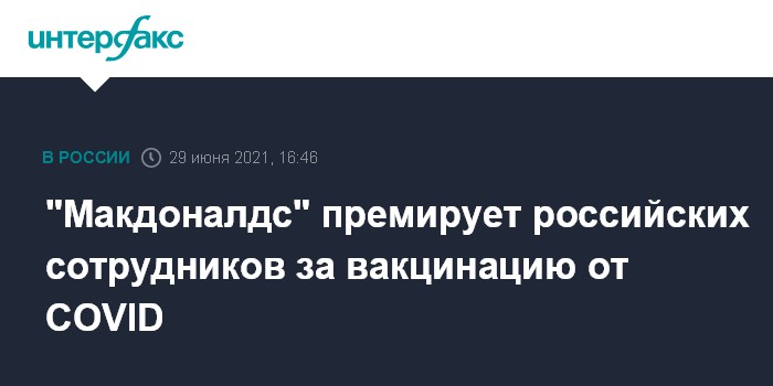 Москва. 29 июня. INTERFAX.RU - "Макдоналдс" в РФ запускает программу финансового стимулирования сотрудников, которые прошли вакцинацию от COVID-19. Она реализуется в рамках комплекса мер, которые компания предпринимает для поддержания безопасности персонала, сообщается в пресс-релизе компании.
