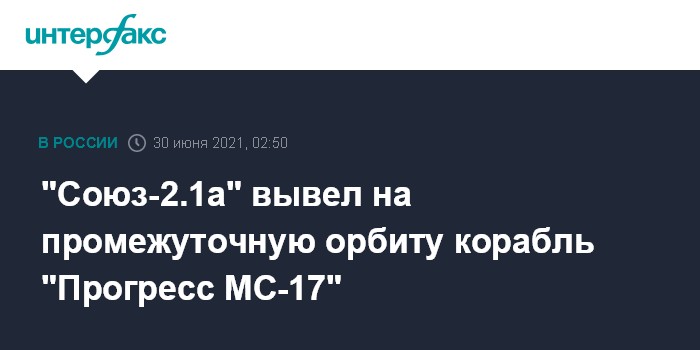Москва. 30 июня. INTERFAX.RU - Ракета-носитель "Союз-2.1а", стартовавшая с космодрома Байконур в среду ночью, вывела на промежуточную орбиту транспортный грузовой корабль "Прогресс МС-17", трансляцию ведет "Роскосмос".