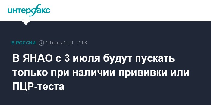 "На Ямале вводятся новые меры безопасности, связанные с распространением коронавирусной инфекции в регионе. Граждане, прибывающие в округ, обязаны будут предъявить либо результаты ПЦР-теста, сделанного не позднее, чем за три дня до приезда, либо сертификат о полной вакцинации с QR-кодом. Мера коснется только тех, кто не имеет ямальской прописки. Требование не распространяется на несовершеннолетних", - говорится в сообщении.