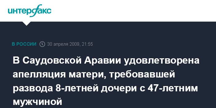 Вашингтон. 30 апреля. INTERFAX.RU - Суд Саудовской Аравии удовлетворил ходатайство матери восьмилетней девочки о разводе с ее 47-летним мужем, сообщает телекомпания CNN со ссылкой на местные СМИ.