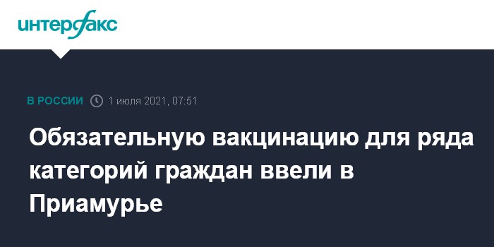 Москва. 1 июля. INTERFAX.RU - Власти Амурской области из-за резкого увеличения случаев заражения COVID-19 приняли решение об обязательной вакцинации отдельных категорий граждан, в том числе, задействованных в сферах массового взаимодействия с населением, сообщает пресс-служба регионального правительства.