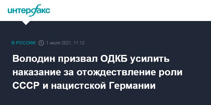 Москва. 1 июля. INTERFAX.RU - Председатель Парламентской ассамблеи Организации Договора о коллективной безопасности (ОДКБ), спикер Госдумы Вячеслав Володин предложил в рамках организации разработать модельные законы, ужесточающие ответственность за отождествление роли СССР и нацистской Германии и унижение чести и достоинства ветеранов Великой Отечественной войны.