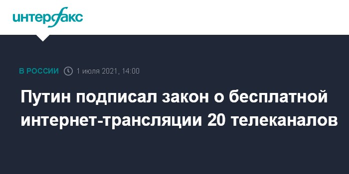 Москва. 1 июля. INTERFAX.RU - Президент России Владимир Путин подписал закон о создании системы бесплатной трансляции телеканалов первого и второго мультиплекса в интернете.