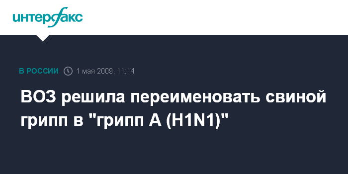 Москва. 1 мая. INTERFAX.RU - Всемирная организация здравоохранения (ВОЗ), начиная с 30 апреля, приняла решение отказаться от использования названия "свиной грипп" и дать вирусу H1N1 название "грипп А (H1N1)", говорится в сообщении, опубликованном на официальном сайте организации.