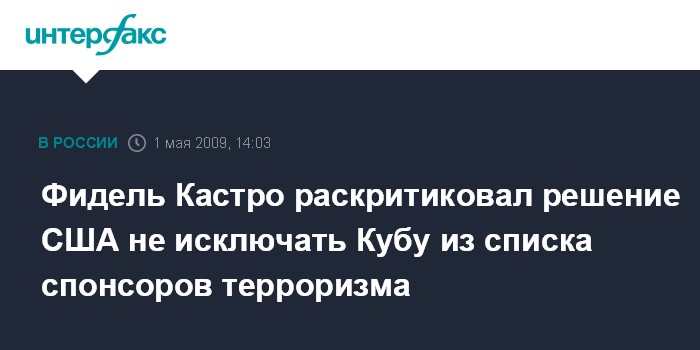 Москва. 1 мая. INTERFAX.RU - Бывший кубинский лидер Фидель Кастро раскритиковал США за отказ исключить Кубу из списка стран, поддерживающих терроризм, и заявил, что Вашингтон хочет, чтобы его страна находилась в положении раба, сообщает в пятницу иранский телеканал "Пресс-ТВ".