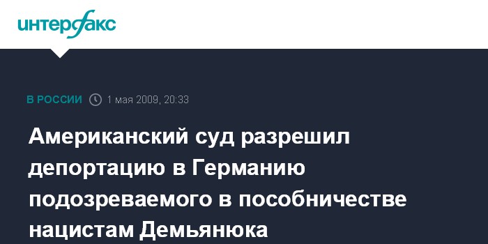 Лондон. 1 мая. ИНТЕРФАКС - Федеральный апелляционный суд США санкционировал депортацию в Германию Ивана Демьянюка, который подозревается в причастности к гибели 29 тыс. заключенных немецкого концлагеря Собибор на территории Польши, сообщает в пятницу британская телерадиокорпорация Би-Би-Си.