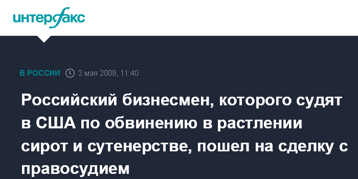 Москва. 2 мая. INTERFAX.RU - Бизнесмен из России Андрей Могилянский, арестованный в декабре 2008 года под Филадельфией за растление малолетних санкт-петербургских сирот и сутенерство, признал себя виновным в обмен на смягчение наказания, сообщает британская телерадиокорпорация Би-Би-Си.