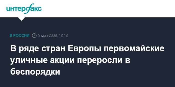 Москва. 2 мая. INTERFAX.RU - Первомайские демонстрации в Германии, Турции и Греции переросли в столкновения с полицией, во Франции и Испании тысячи людей выразили недовольство действиями властей в условиях мирового экономического кризиса, сообщает в субботу британская телерадиокорпорация Би-Би-Си.