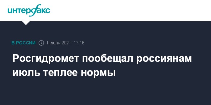 Москва. 1 июля. INTERFAX.RU - На всей территории России температура воздуха в июле ожидается немного выше климатической нормы, осадки - в пределах нормы, следует из прогноза Росгидромета, опубликованного в четверг.