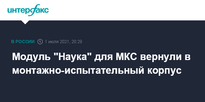 Москва. 1 июля. INTERFAX.RU - Многофункциональный лабораторный модуль (МЛМ) "Наука", который в июле должен отправиться на МКС, возвращен в монтажно-испытательный корпус РКК "Энергия" для устранения замечания, сообщили "Интерфаксу" в пресс-службе "Роскосмоса".