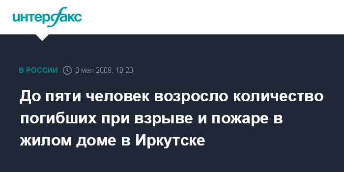 Москва. 3 мая. INTERFAX.RU - Число жертв взрыва и последовавшего за ним пожара в двухэтажном деревянном доме в Иркутске увеличилось до пяти человек, сообщили агентству "Интерфакс-Сибирь" в воскресенье в пресс-службе Сибирского регионального центра МЧС России.
