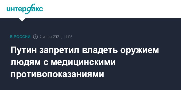 Москва. 2 июля. INTERFAX.RU - Президент РФ Владимир Путин подписал закон, который вводит запрет на приобретение, хранение, ношение и использование оружия лицами, не прошедшими медосвидетельствование на наличие медицинских противопоказаний.