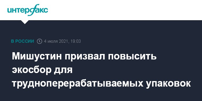 Москва. 4 июля. INTERFAX.RU - Ставки экологического сбора для трудноперерабатываемых и неперерабатываемых товаров и упаковок должны быть повышены, заявил премьер-министр РФ Михаил Мишустин на встрече с представителями российского и иностранного бизнеса, прошедшей на полях форума Иннопром-2021.