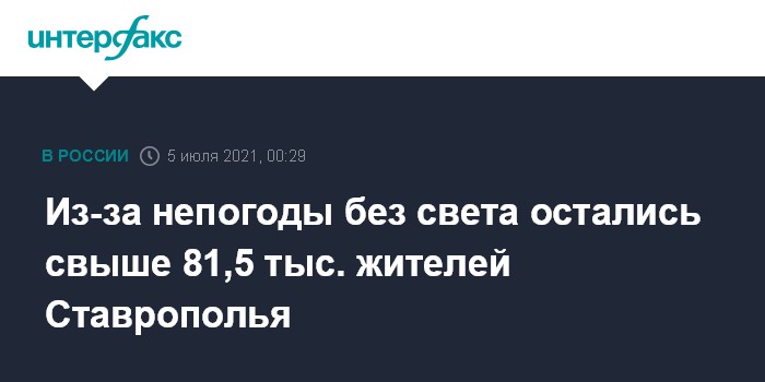 Ранее сообщалось, что в результате сильного дождя и порывов ветра произошло отключение электроснабжения в городе Ставрополе (2427 человек) и селе Надежда Шпаковского округа (6631 человек).