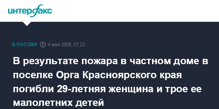Красноярск. 4 мая. ИНТЕРФАКС-СИБИРЬ - Трое малолетних детей и их мать погибли при пожаре в собственном частном доме в поселке Орга (Боготольский район Красноярского края), сообщили "Интерфаксу" в пресс-службе Главного управления МЧС по Красноярскому краю.