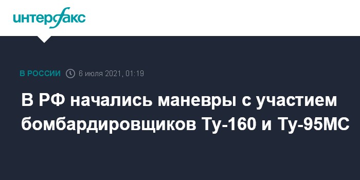 Москва. 6 июля. INTERFAX.RU - Способные нести ядерное оружие стратегические ракетоносцы-бомбардировщики Ту-160 и Ту-95МС участвуют в маневрах дальней авиации, которые начались в России.