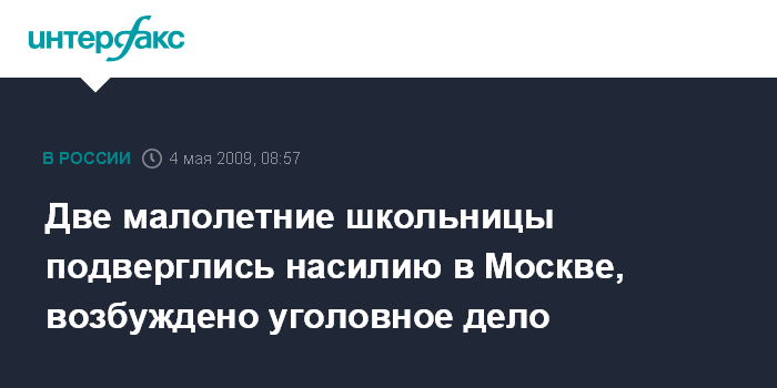 Москва. 4 мая. INTERFAX.RU -На севере столицы в воскресенье вечером неизвестный изнасиловал двух девочек, одной из которых девять, а другой семь лет, сообщил "Интерфаксу" в понедельник источник в правоохранительных органах города.