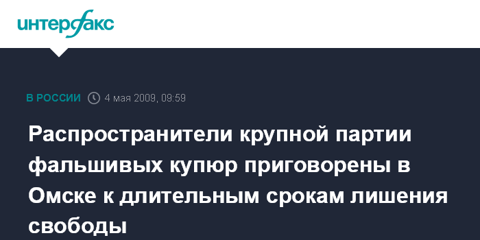 Москва. 4 мая. INTERFAX.RU - Омский областной суд вынес приговор двум обвиняемым в распространении на территории Сибирского федерального округа фальшивых купюр на сумму не менее чем 1,5 млн рублей.