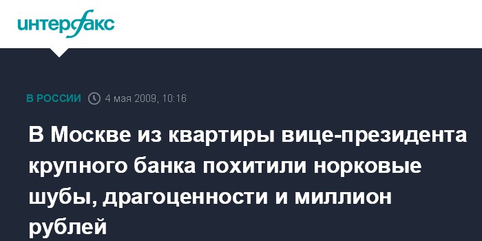 Москва. 4 мая. INTERFAX.RU - На юго-западе столицы из квартиры первого вице-президента крупного банка похитили деньги и ценности на сумму около 2,5 млн рублей, сообщил "Интерфаксу" источник в правоохранительных органах города в понедельник.