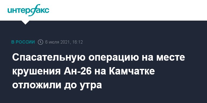 Москва. 6 июля. INTERFAX.RU - Спасательная операция на Камчатке по поиску потерпевшего крушение самолета Ан-26 приостановлена из-за неблагоприятных погодных условий, работы возобновятся утром.