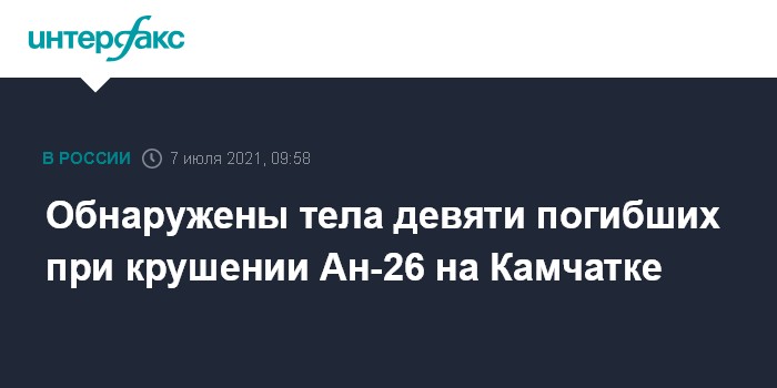 Москва. 7 июля. INTERFAX.RU - В МЧС РФ сообщили о обнаружении тел девяти погибших при крушении Ан-26 на Камчатке, одно тело опознано.