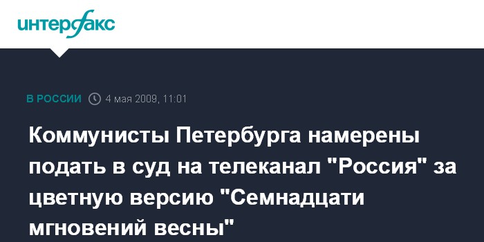 Москва. 4 мая. INTERFAX.RU - Коммунисты Петербурга и Ленинградской области собираются подать в суд на создателей цветной версии телефильма "Семнадцать мгновений весны", показ которой начинается в понедельник.