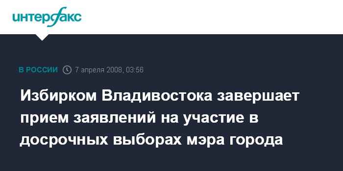 Владивосток. 7 апреля. ИНТЕРФАКС-ДАЛЬНИЙ ВОСТОК - Количество претендентов на пост мэра Владивостока, досрочные выборы которого пройдут 18 мая, достигло 25.