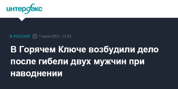 Москва. 7 июля. INTERFAX.RU - Гибель двух человек во время подтопления в Горячем Ключе (Краснодарский край) будут расследовать в рамках уголовного дела по статье о причинении смерти по неосторожности. Об этом сообщает пресс-служба следственного управления СК РФ по краю.