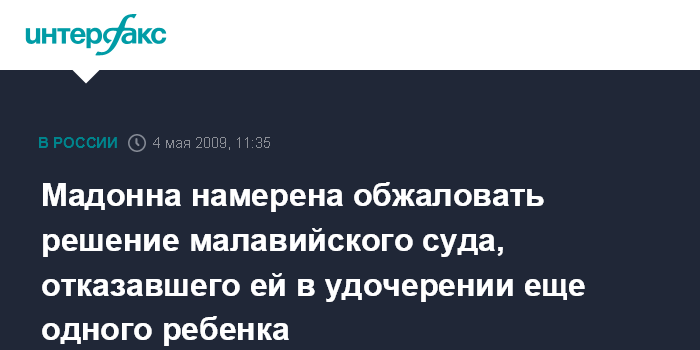 Москва. 4 мая. INTERFAX.RU - Адвокаты певицы Мадонны намерены обратиться в суд африканской страны Малави, чтобы обжаловать решение суда, месяц назад отказавшего певице в удочерении четырехлетней девочки, сообщает в понедельник британская телерадиокорпорация Би-би-си.