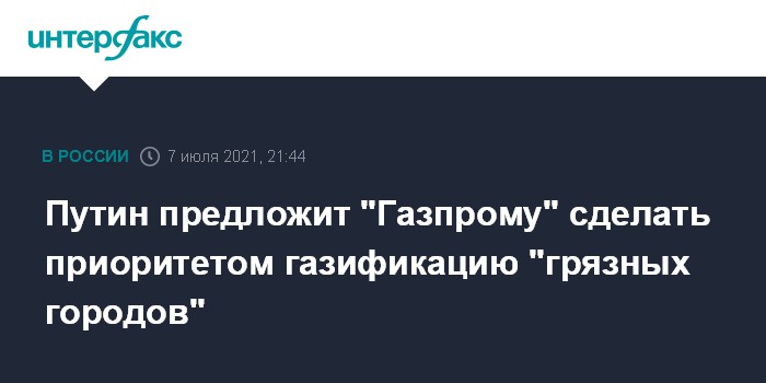 Козлов напомнил, что в настоящее время действует указ президента "о 12 грязных городах", в числе которых Братск, Омск, Нижний Тагил. "Разрешите дать поручение "Газпрому", чтобы для них это (газификация - ИФ) был приоритет, в том числе в рамках программы "Чистый воздух" для 12 этих городов", - сказал министр.