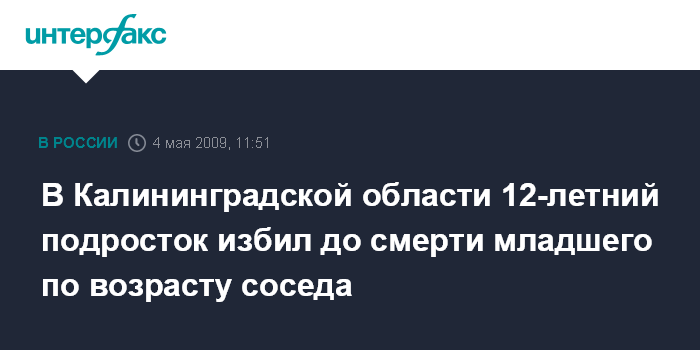 Москва. 4 мая. INTERFAX.RU - В городе Черняховск Калининградской области 12-летний мальчик забил насмерть младшего по возрасту соседа, сообщили "Интерфаксу" в понедельник в региональном УВД.