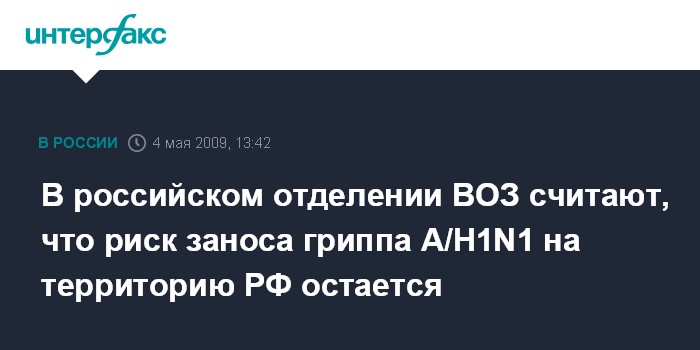 Москва. 4 мая. INTERFAX.RU - Риск попадания на территорию России свиного гриппа сохраняется, считают в российском отделении Всемирной организации здравоохранения.