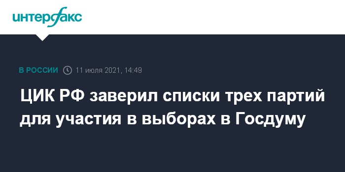 Москва. 11 июля. INTERFAX.RU - Центризбирком России в воскресенье заверил списки партий "Единая Россия", "Справедливая Россия - Патриоты - За правду" и КПРФ для участия в сентябрьских выборах депутатов Госдумы VIII созыва. Также принято решение об открытии специальных избирательных счетов партий для ведения кампании.