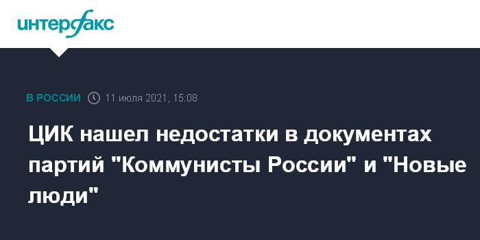 Москва. 11 июля. INTERFAX.RU - ЦИК РФ обнаружил недостатки в предоставленных документах на заверение списков для участия в выборах в Госдуму VIII созыва от партий "Коммунисты России" и "Новые люди" по одномандатным округам.