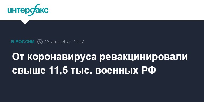 Москва. 12 июля. INTERFAX.RU - Плановую ревакцинацию от коронавирусной инфекции COVID-19 прошли более 11,5 тысяч российских военнослужащих, при этом использовался отечественный препарат, сообщает в понедельник министерство обороны РФ.