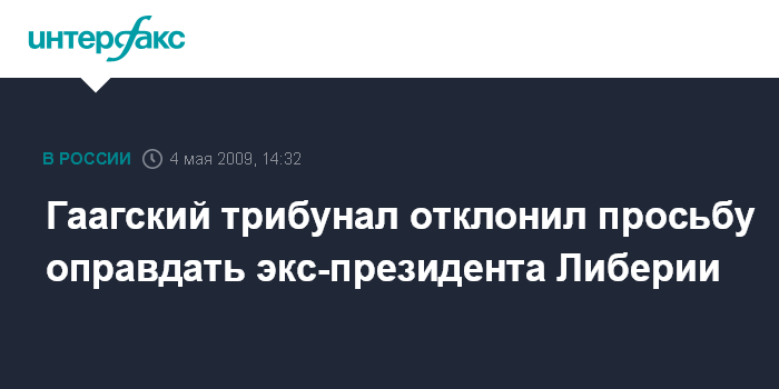 Лондон. 4 мая. INTERFAX.RU - Международный трибунал по военным преступлениям в Сьерра-Леоне отклонил прошение оправдать бывшего президента Либерии Чарльза Тейлора, обвиняемого в совершении преступлений против человечности, сообщает в понедельник британская телерадиокорпорация BBC.