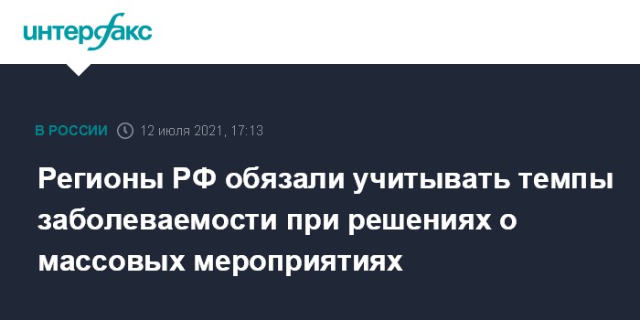 Москва. 12 июля. INTERFAX.RU - Региональные власти должны принимать решения о возможности проведения массовых мероприятий с учетом коэффициента распространения COVID-19, темпа прироста заболеваемости за неделю и охвата тестирования населения методом ПЦР.