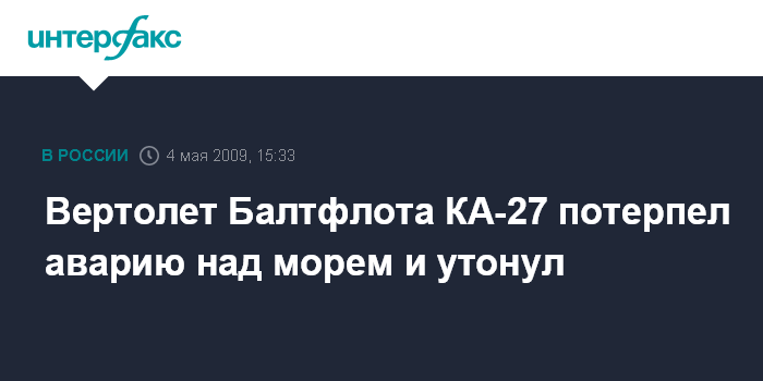 Москва. 4 мая. INTERFAX.RU - Вертолет Балтийского флота (БФ) КА-27 в понедельник потерпел аварию над морем и затонул, сообщил "Интерфаксу" в понедельник источник в штабе флота.
