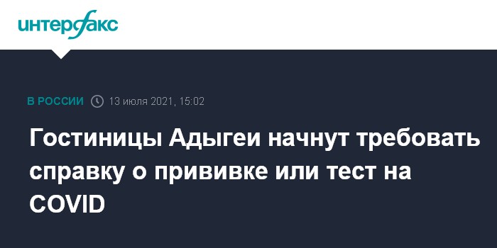 Москва. 13 июля. INTERFAX.RU - Адыгея вводит требование об обязательном предъявлении сертификата о прививке или отрицательного ПЦР-теста на коронавирус для туристов, заселяющихся в гостиницы, и работников туротрасли, сообщается во вторник на сайте правительства республики.