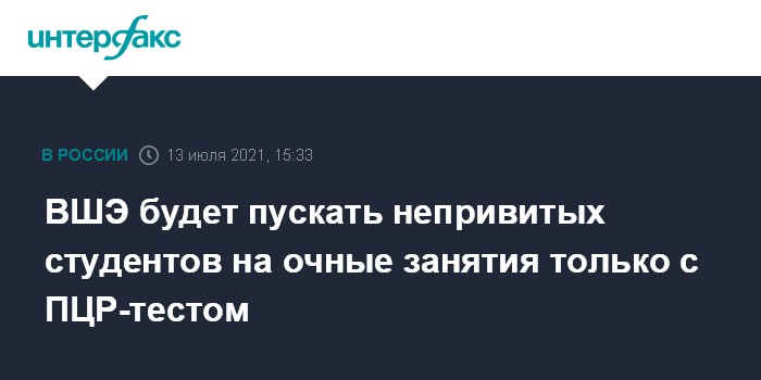 Москва. 13 июля. INTERFAX.RU - Не переболевшие коронавирусом и не привившиеся студенты Национального исследовательского университета "Высшая школа экономики" с начала учебного года не смогут попасть на очные занятия в ограниченных группах без отрицательного ПЦР-теста, первокурсникам предложат сделать прививку до 30 сентября, сообщается на сайте вуза.