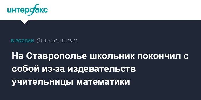 Москва. 4 мая. INTERFAX.RU - Следственные органы СКП РФ по Ставропольскому краю завершили расследование уголовного дела в отношении учителя математики средней школы N 2 села Александровское, обвиняемой в оскорблении (ч. 2 ст. 130) и доведении до самоубийства учащегося 9-го класса этой же школы (ст.110) УК РФ.