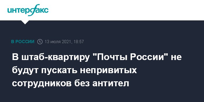 Москва. 13 июля. INTERFAX.RU - "Почта России" изменила режим прохода в офис и разрешила туда приходить не более 10% сотрудников одновременно и только тем, кто имеет прививку от коронавируса или антитела, сообщили "Интерфаксу" в компании. Позднее там уточнили, что пока речь идет только о штаб-квартире в Москве.