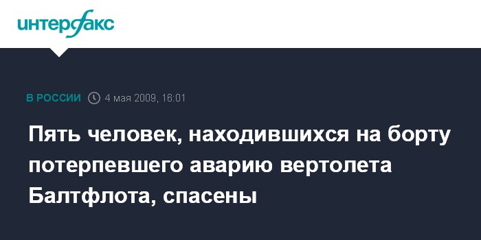 Москва. 4 мая. INTERFAX.RU - Экипаж и пассажиры вертолета Балтийского флота (БФ) КА-27, который в понедельник потерпел аварию над морем и затонул, спасены, сообщили "Интерфаксу" в военно-следственном управлении БФ.