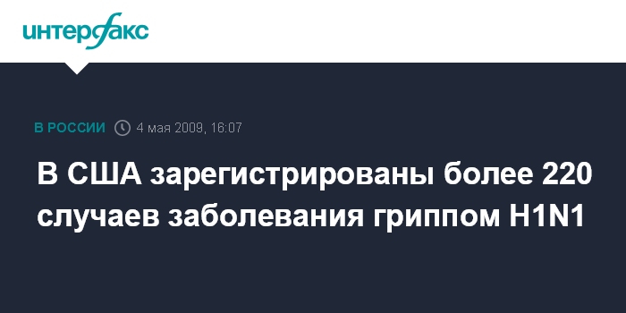 Москва. 4 мая. INTERFAX.RU - Число подтвержденных заражений людей вирусом A/H1N1 в 30 штатах США в понедельник достигло 226 человек, сообщает британская телерадиокорпорация Би-би-си со ссылкой на заявление Минздрава страны.